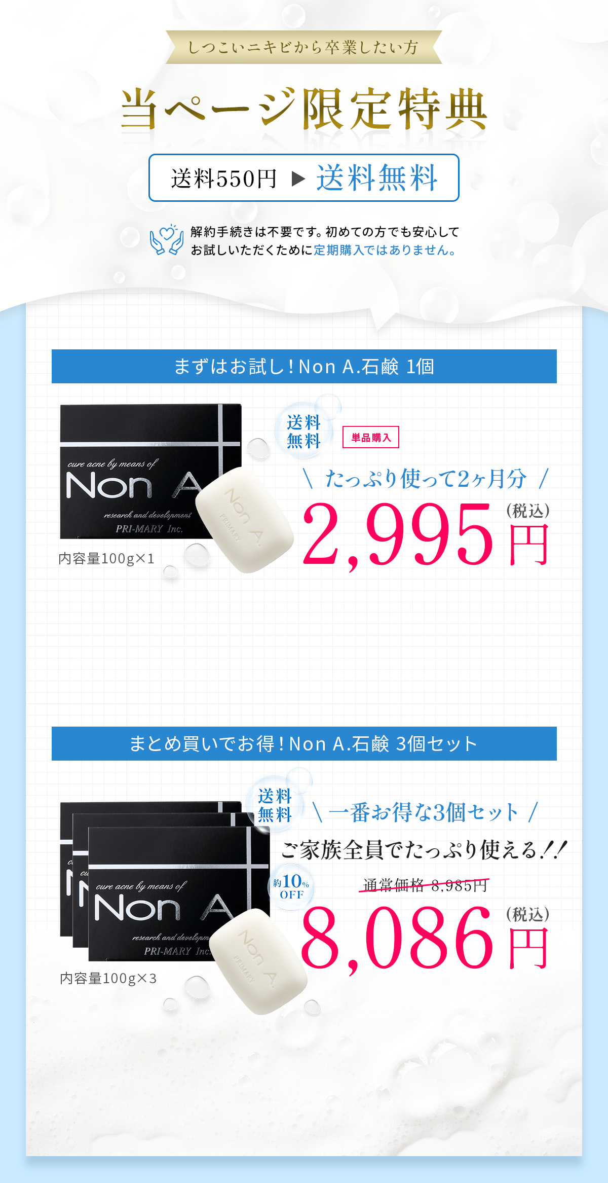 Non A(ノンエー)は弾力があるので手を下に向けても落ちません! ポイント1 石鹸史上の最高の泡だち!優しい洗顔で皮脂をオフ! 通常の石ケン素地に比べ約4倍の弾力泡があなたの肌を包みます。 ポイント2 トラブルを抑える成分はナチュラルな厳選素材を使用!